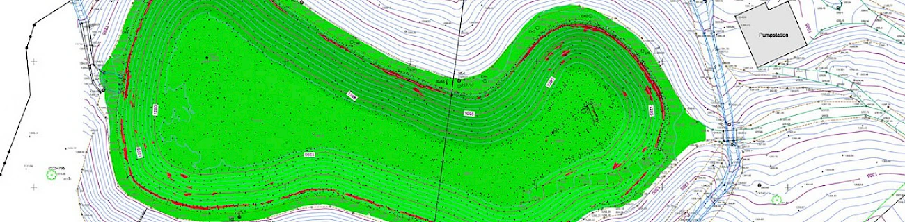 Ausgehend von den Naturbestandsvermessungen können in weiterer Folge digitale Geländemodelle erzeugt werden. Diese bilden dann die Grundlage für die Berechnung von Höhenschichten, Geländeschnitten (Quer- u. Längsprofile) oder 3D-Modellierungen. Natürlich kombinieren wir auch unsere Messdaten mit anderen Informationen wie z.B. Laserscandaten aus Befliegungen oder Höheninformationen aus der Luftbildauswertung um damit einen Mehrwert zu erzielen.